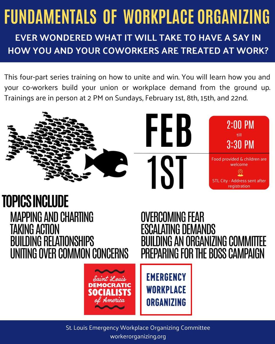 The Emergency Workplace Organizing Committee and DSA Labor Committee are hosting this four-part training every Sunday in February (Feb. 1st, 8th, 15th, and 22nd) from 2pm to 3:30pm. Each week will cover an essential aspect of organizing your workplace to win demands, organize a union, or strengthen an existing bargaining unit. From building a strong organizing committee, having successful organizing conversations, escalating collective action, and preparing for the boss' push-back, this training will help get workers started making real improvements at work.