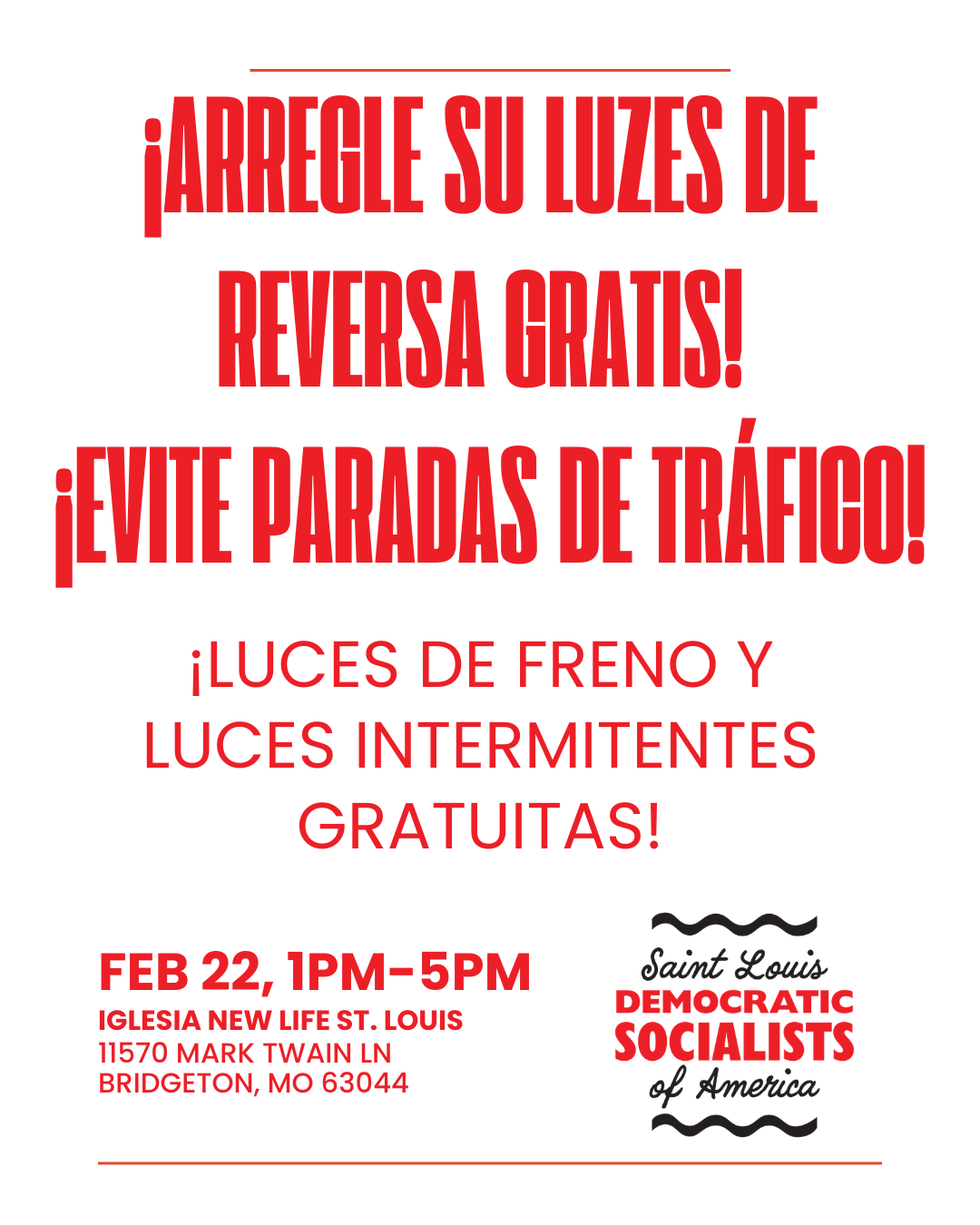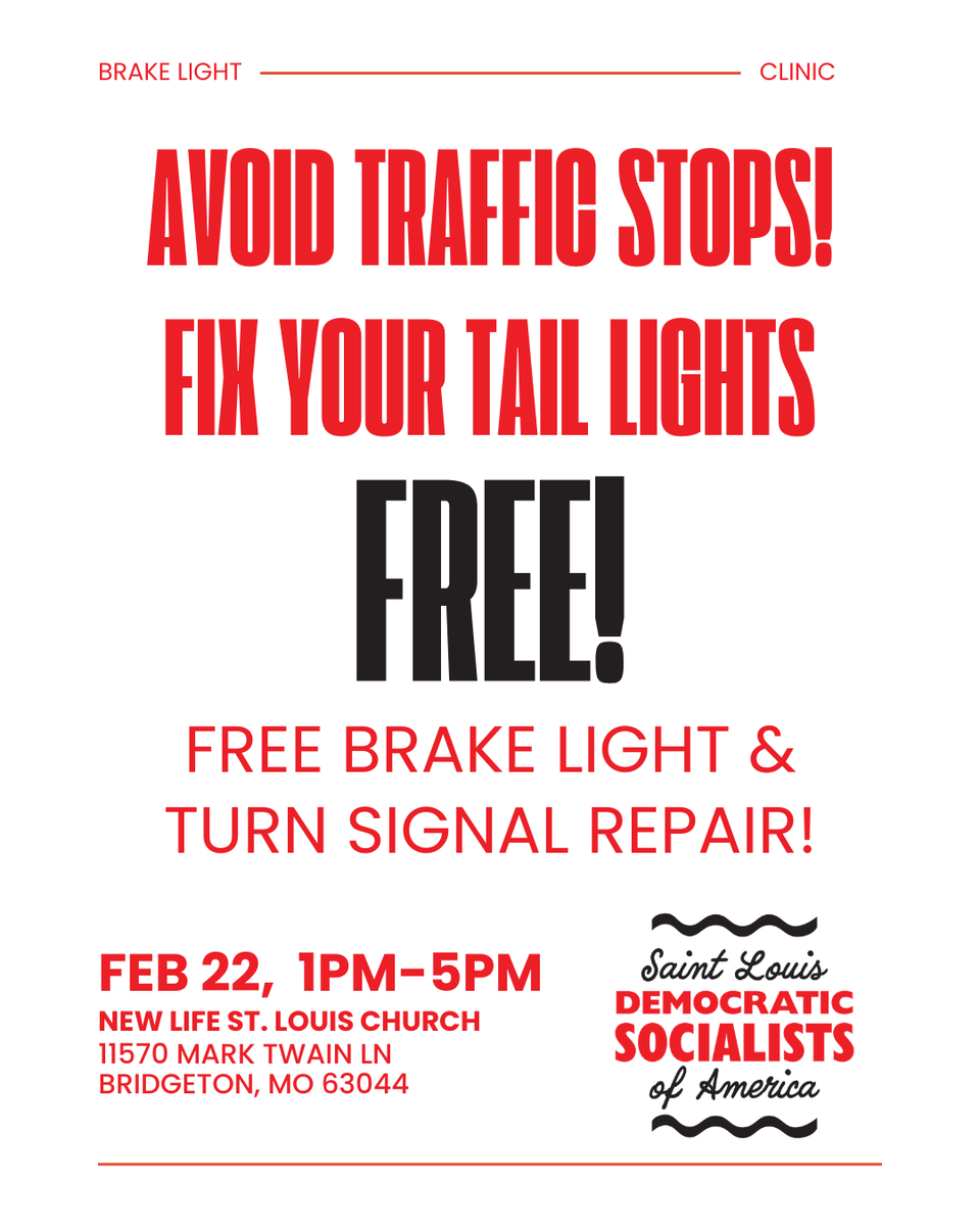 Join us to fix people's brake lights and keep them safe from police / ICE harassment. We will be in the west parking lot of New Life St. Louis church on the southwest corner of the parking lot. Meet at New Life St. Louis Church, 11570 Mark Twain Ln, St. Louis, MO 63044 from 1PM to 5pm.